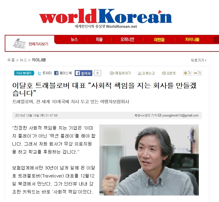 보험업계에서만 30년이 넘게 일해 온 이달호 트래블로버(Travelover) 대표를 12월12일 북경에서 만났다. 그가 인터뷰 내내 강조한 키워드는 바로 ‘사회적 책임’이었다....