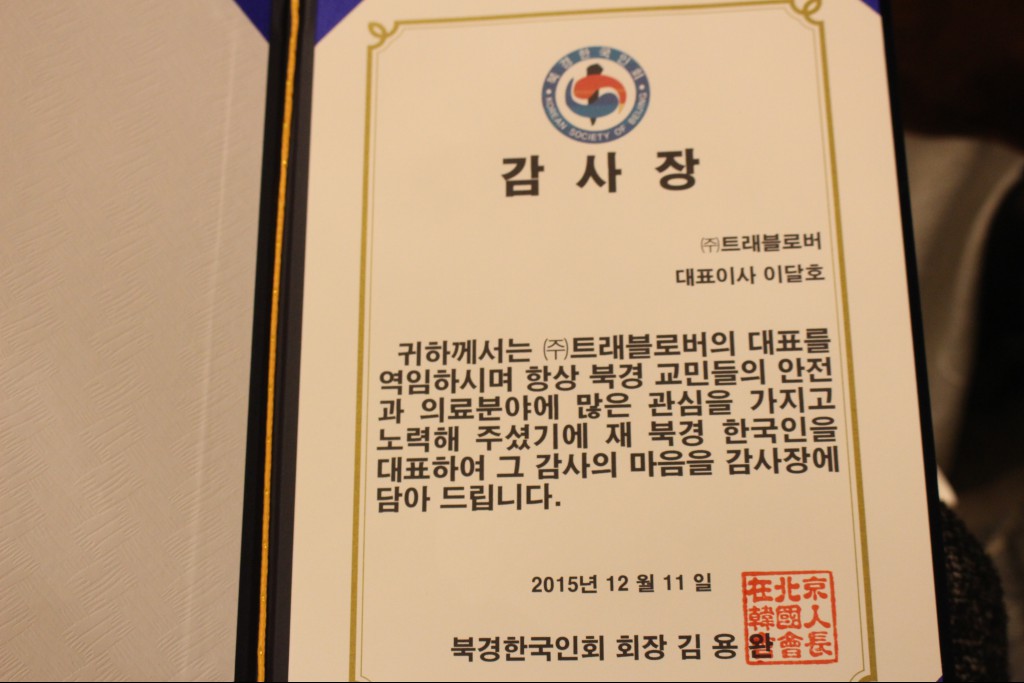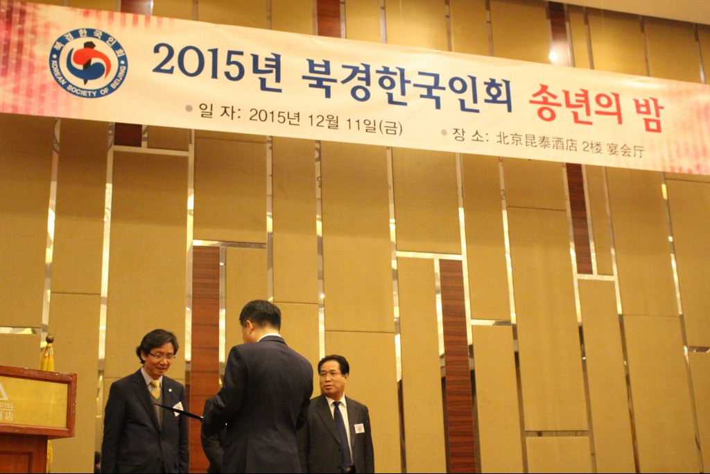 당사 대표가 북경한인회로부터 감사패를 전달 받고 있습니다.